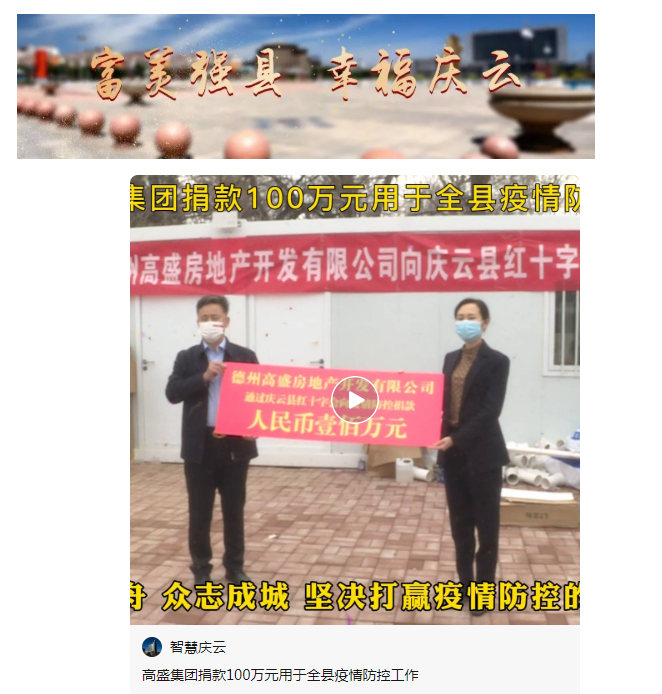 单笔数额最大丨高盛集团捐款100万元用于庆云疫情防控工作!