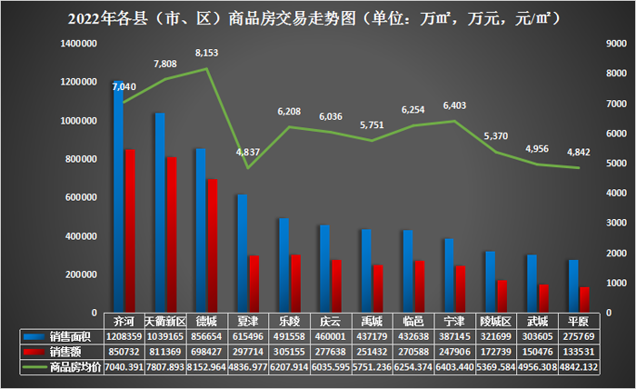 3、区域房地产投资情况。分区域来看,2022年齐河县和天衢新区商品房投资势头依然强劲,投资额远高于其他县(市、区)。全市7个县(市、区)投资额增速上涨明显,有力地拉动了我市商品房投资额的正增长,其中乐陵市增速达39.9%,为全市最高;齐河县次之,增速19.5%。