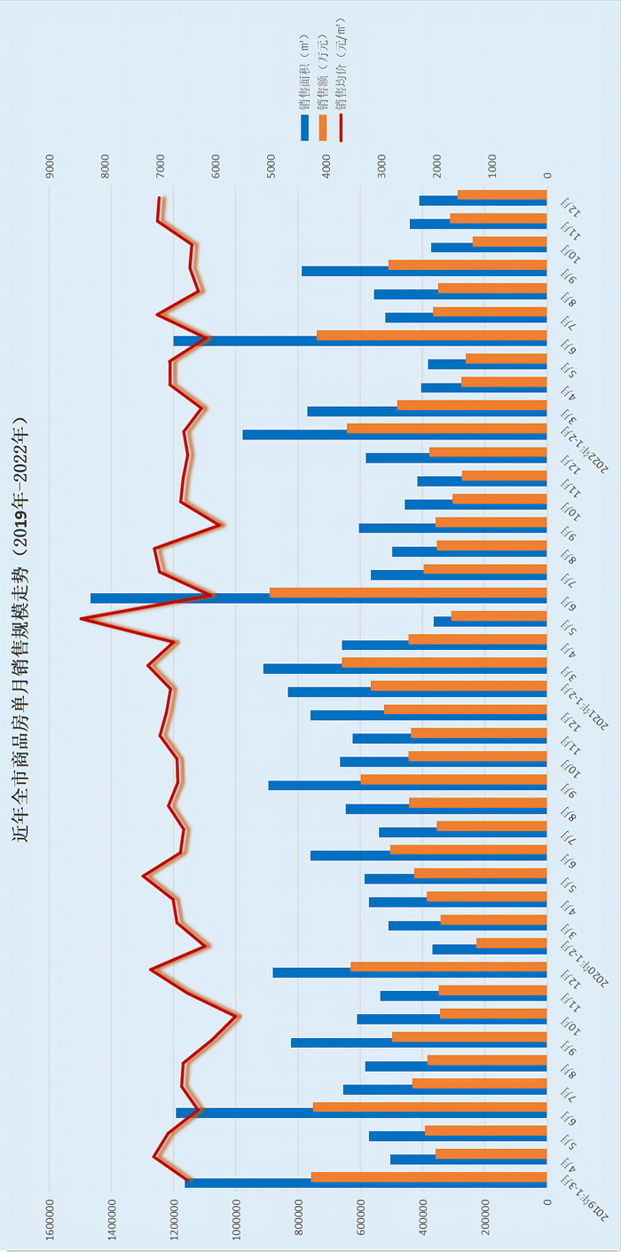 (1)销售规模年末翘尾。2022年,中心城区商品房销售面积189.6万㎡,同比增速-18.5%;其中住宅销售面积170.7万㎡,同比增速-21.6%。销售额151万㎡,同比增速-18.8%;其中住宅实现销售额141.4万㎡,同比增速-21.4%。