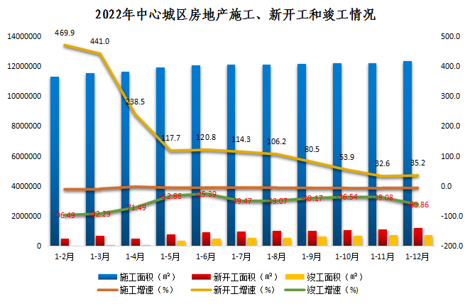 2、2014年以来的商品房建设走势分析。从近年来全市商品房施工、竣工和新开工情况分析,施工面积增速曲线较为平缓,2022年的施工面积为市场环境下的正常回落。
